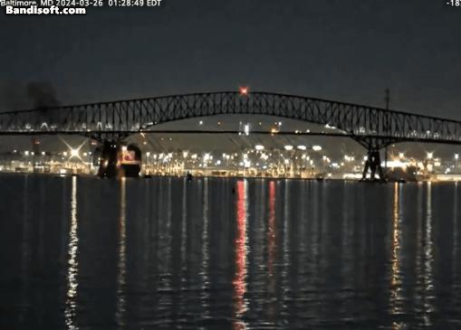 周二凌晨 1 点多," 达利号 " 撞上了一个支撑物,导致大桥坍塌。一段实时视频显示,就在撞击之前,桥上还有汽车和卡车。这艘船没有沉没,船上的灯仍然亮着。
