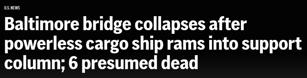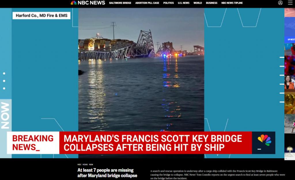 综合 NBC 新闻、The Daily Beast 3 月 26 日报道 3 月 26 日周二清晨,美国马里兰州巴尔的摩的一座主桥被一艘货轮撞击,大桥在 30 秒内坍塌,数辆汽车坠入桥下冰冷的河水中,引发了一场紧张的幸存者搜寻行动,全美最繁忙的港口之一也因此关闭。