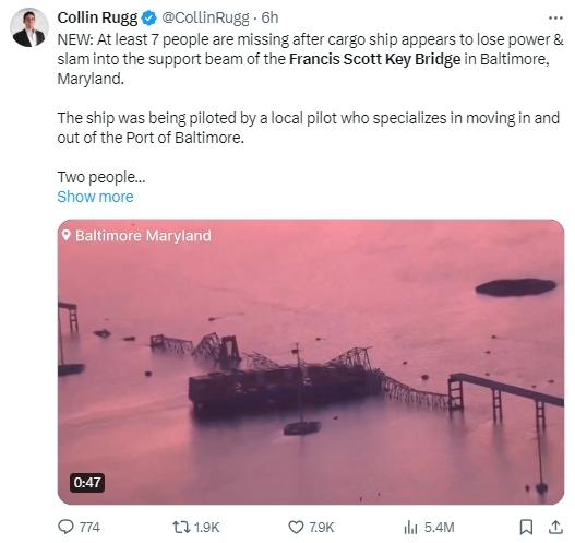 马里兰州州长韦斯 · 摩尔(Wes Moore)宣布进入紧急状态,并表示撞毁弗朗西斯 · 斯科特 · 基大桥(Francis Scott Key Bridge)的灾难很可能是一起意外事故,而非恐怖主义行为。摩尔说:" 我们的州处于震惊之中。"