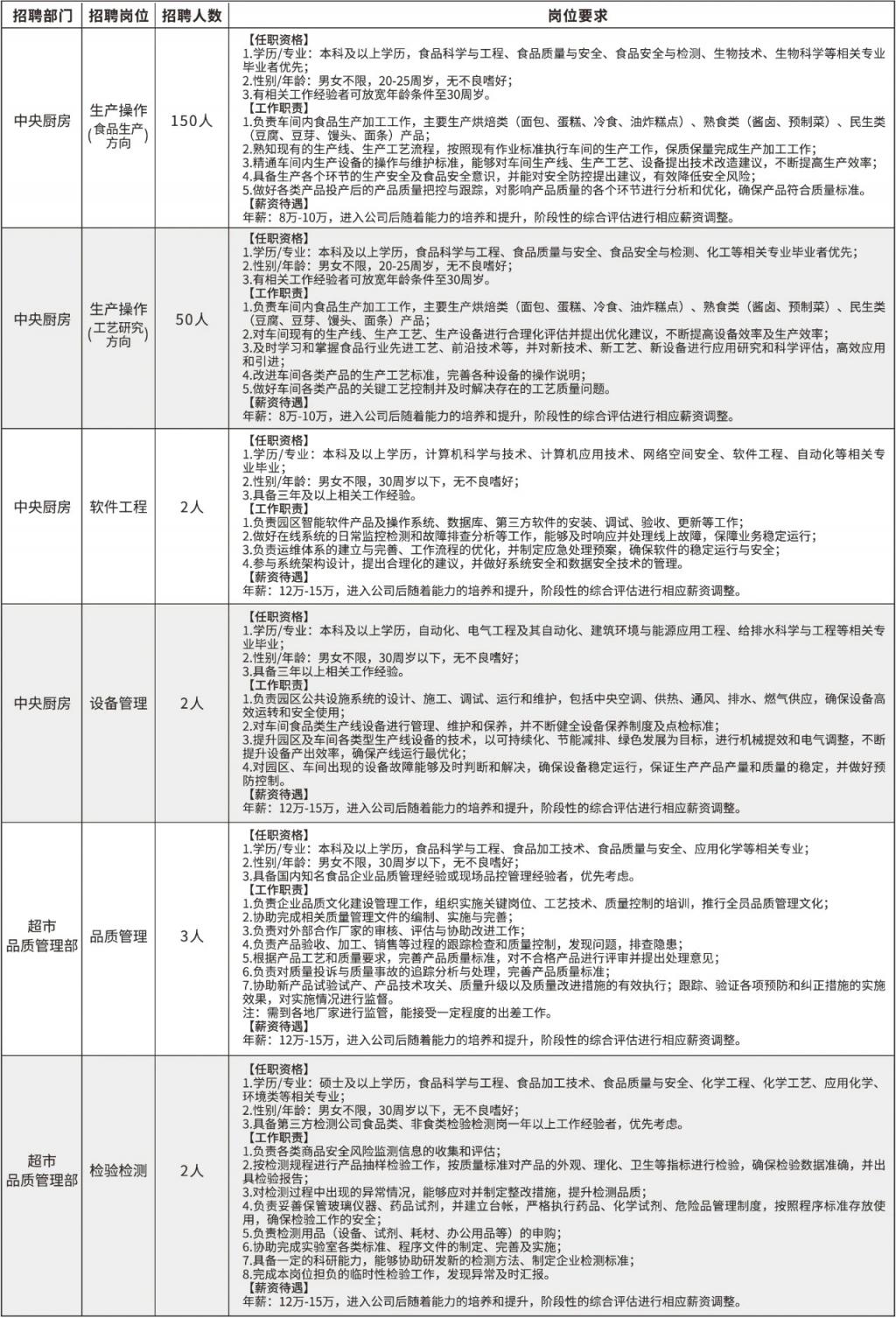 胖东来本次招聘 209 人,涉及岗位包括:中央厨房生产操作、中央厨房软件工程、超市品质管理部品质管理,其中生产操作(食品方向、工艺研究方向)是本次招聘人数最多的岗位,两个岗位总计招聘 200 人。薪资待遇方面,最高年薪为 15 万元,并注明进入公司后随着能力的培养和提升,阶段性的综合评估进行相应薪资调整。