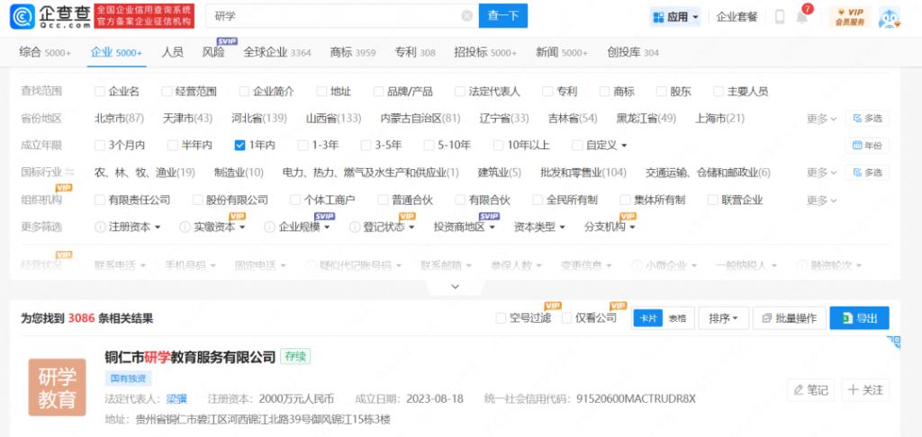 奇偶派在企查查 App 上以 " 研学 " 为关键词进行搜索,成立时间在 1 年内的公司信息高达 3086 条。