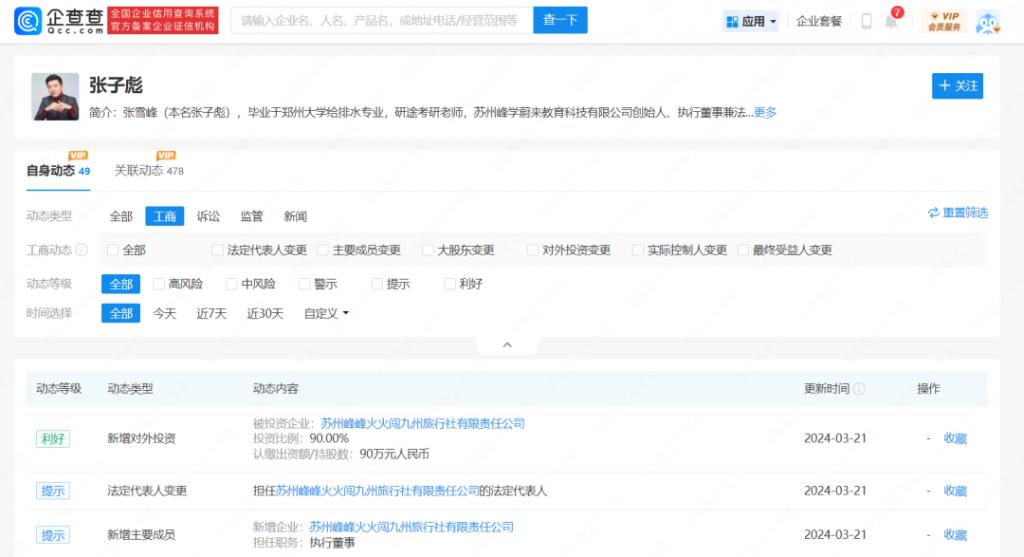 企查查 App 看到,3 月 20 日,苏州峰峰火火闯九州旅行社有限责任公司成立,张子彪(即张雪峰)是其法定代表人及大股东,持股比例达 90%。此前的 3 月 12 日,同样由张雪峰持股 90%并担任法定代表人的苏州峰峰火火旅行社有限责任公司成立。两家公司的经营范围均包括了旅行社服务网点旅游招徕、旅游开发项目策划咨询、教育咨询服务等。