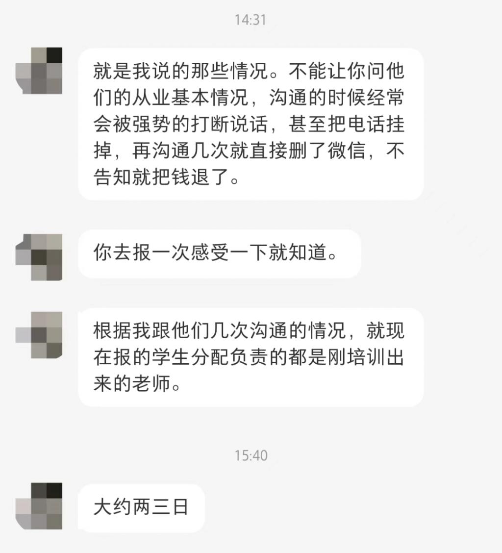 来自江苏的吴瑾是张雪峰的忠实粉丝,今年 2 月底为自己的女儿买了一套《圆梦卡》选个好专业,没想到迎来的是一套 " 碎梦 " 服务," 本来先询问了下大学毕业后的就业情况,但是老师沟通的时候经常会强势打断发言,甚至会直接挂掉电话,再沟通几次就直接删微信,还会在不告知的情况下直接退费,再也不联系我们 "。