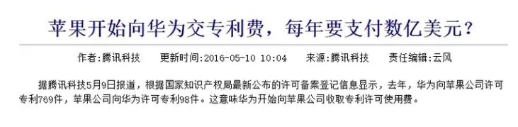 从 2015 年开始,数据显示苹果向华为授权专利 98 件,而华为反过来向苹果公司授权的专利已经高达 769 件。