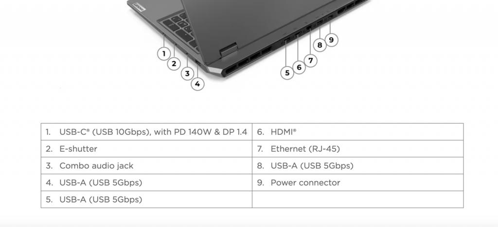 新机采用与 G5000 2023 款游戏本不同的模具设计,接口全部位于机身尾部与右侧,拥有一个 USB-C 与三个 USB-A、HDMI 与 RJ45 网口。USB-C 接口为 10Gbps 速率,支持 140W PD 充电与 DP 1.4 视频输出;USB-A 接口均为 5Gbps 速率。