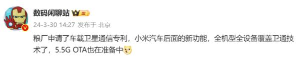 除了透露了小米的 5.5G 进展外,其还表示小米已经申请了车载卫星通信专利。根据天眼查提供的信息,小米汽车科技有限公司公布了一项名为 " 对星方法、装置、介质及车辆 " 的专利。该专利主要聚焦于车辆领域,其目的在于提升对星速度,增强卫星通信通道的时效性和便利性,并优化实际的卫星通信质量。博主表示,该功能将会是小米汽车的一项新技术,不过目前不清楚是之后的小米车型才支持,还是小米 SU7 同样可以通过 OTA 进行升级。