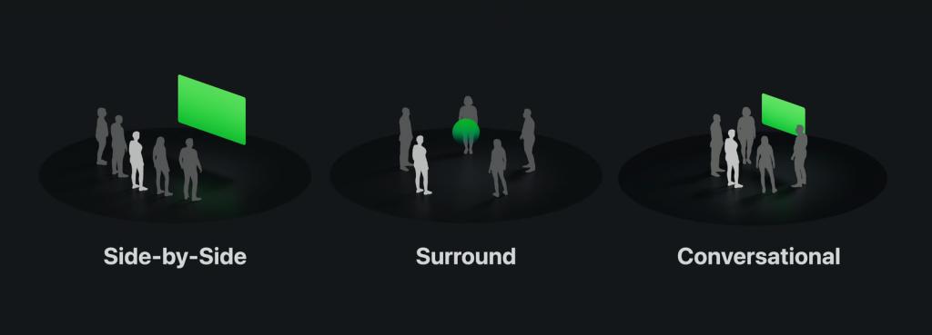 苹果在官网上也发布了「空间人物形象」开发指南,为开发者提供了三种「空间人物形象」定位模板:并排场景(Side-By-Side)、环绕场景(Surround)和对话场景(Conversational),可以支持 2-5 人使用。