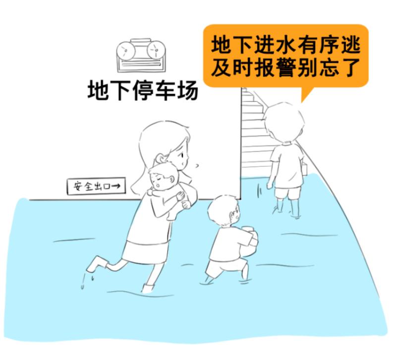如遇地铁、地下车库、地下商场等进水,不要惊慌,迅速找到最近出口有序逃离。如果被困,要拨打 110 或 119 求救;如果没带手机或手机无信号,要呼喊求救或敲击物品,晃动颜色鲜艳的衣服,增加被发现的可能性。