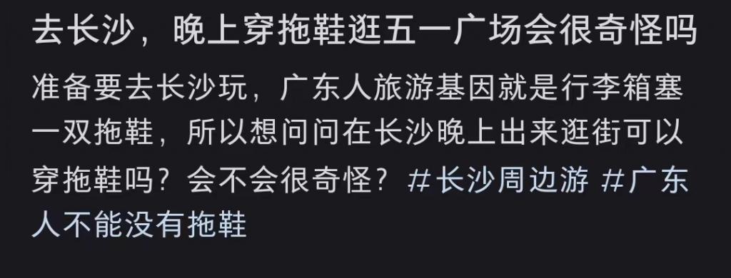 看出来广东人很爱长沙了,来打卡的广东人已经有一种回家的松弛感,刻在 DNA 里的拖鞋之魂都藏不住了!甚至有人提问:穿拖鞋逛五一广场会很奇怪吗?