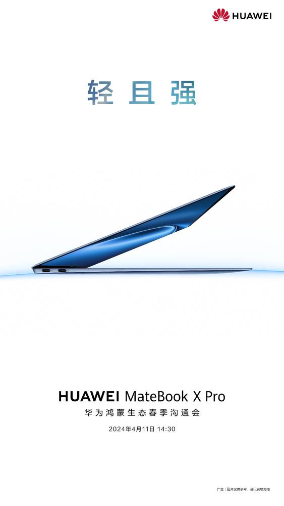 【CNMO 新闻】4 月 10 日,华为官方正式官宣华为 MateBook X Pro 新品定档 4 月 11 日,并且发布了首张预热海报。海报的主体所配文案是 " 轻且强 ",暗示新品在轻薄度以及性能方面均有突破,此外 " 轻了,强了,AI 了 " 的文案也向消费者宣布此次全新的华为 MateBook X Pro 在 AI 方面会有突破。