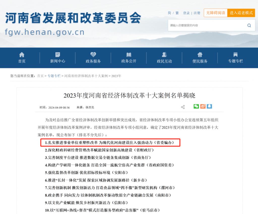 4 月 9 日,河南省发改委网站发布了《2023 年度河南省经济体制改革十大案例名单揭晓》。其中,河南省委编办 " 扎实推进事业单位重塑性改革 为现代化河南建设注入强劲动力 " 的改革案例上榜。