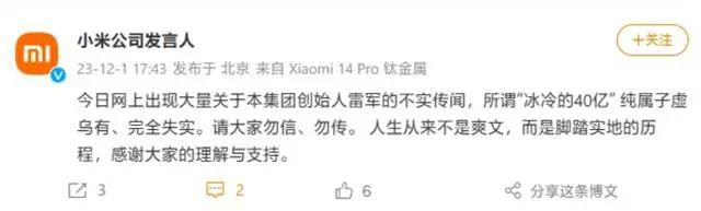2023 年 12 月 1 日,小米公司通过其官方微博 @小米公司发言人表示,今日网上出现大量关于本集团创始人雷军的不实传闻,所谓 " 冰冷的 40 亿 " 纯属子虚乌有、完全失实。请大家勿信、勿传。人生从来不是爽文,而是脚踏实地的历程,感谢大家的理解与支持。