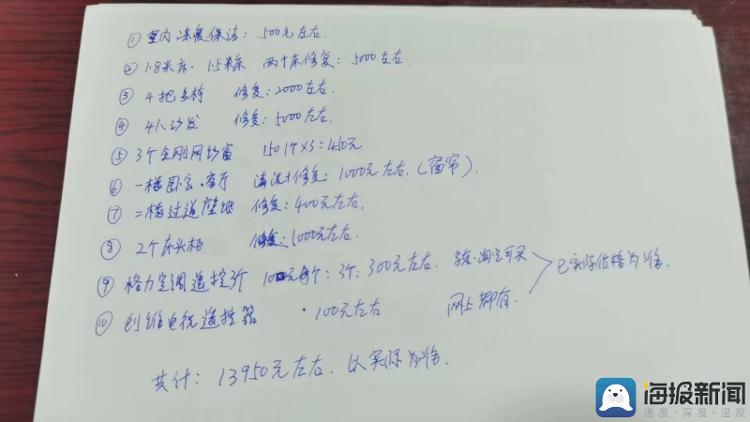 刘先生称,中介曾发给他一张维修预算报价单。通过刘先生提供的上述报价单,记者发现,报价单上显示,需要修复的共有 10 处,包括室内深度保洁:500 元左右;两张床修复:5000 元左右;4 把餐椅:2000 元左右;4 人沙发修复:5000 元左右;2 个床头柜修复:1000 元左右等,共计 13950 元左右,以实际为准。刘先生表示,对方并不能向他提供这些费用的发票,所以他无法判断最后是否花费了这些费用。