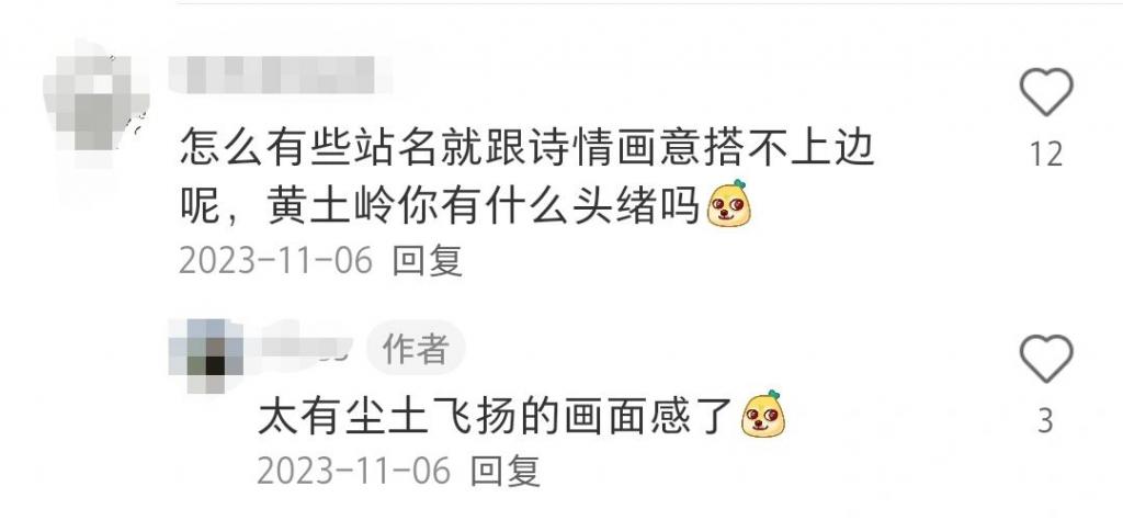 一位网友在大家点评诗意站名时表示," 怎么有些站名就跟诗情画意搭不上边呢,黄土岭你有什么头绪吗?"