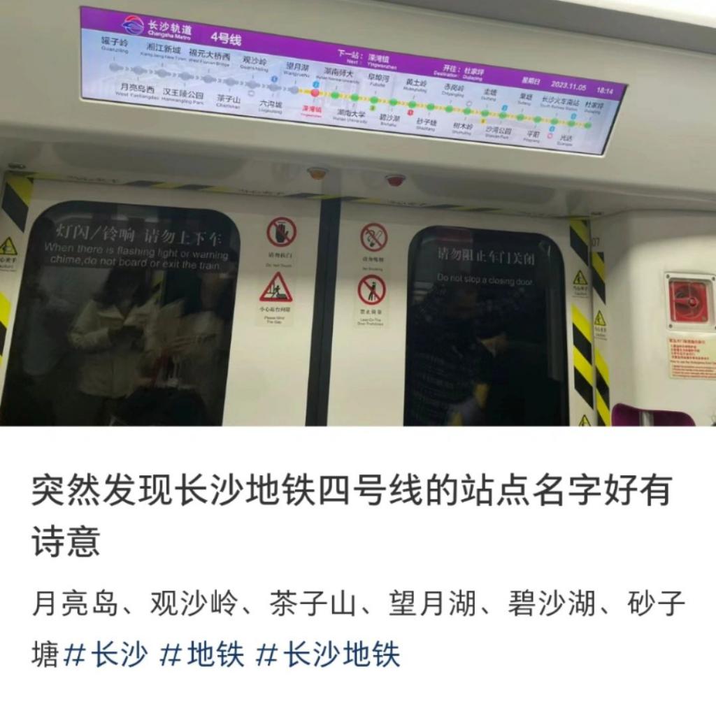 来自某网络平台 2023 年末的一条帖子中,一位网友表示," 突然发现长沙地铁四号线的站点名字好有诗意 ",并点名列举了月亮岛、观沙岭、茶子山、望月湖、碧沙湖等站名。