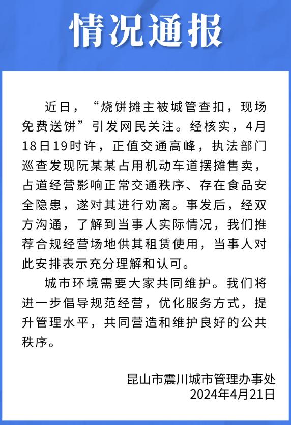 江苏昆山一烧饼摊主被查扣,现场免费送饼?当地通报