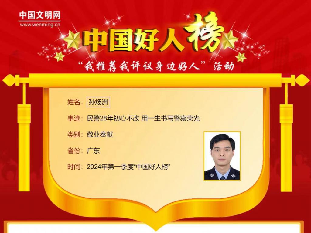 近日,2024 年第一季度 " 中国好人榜 " 发布仪式暨全国道德模范与身边好人现场交流活动在江西省九江市举行。经行业系统和各地推荐、网友点赞评议、专家评审等环节,共有 152 名(组)助人为乐、见义勇为、诚实守信、敬业奉献、孝老爱亲身边好人光荣上榜,其中包括全国公安系统 12 名个人,广东省 7 名个人。广东省揭阳市公安局环食药侦支队原四级高级警长孙炀洲当选 " 敬业奉献 " 好人。