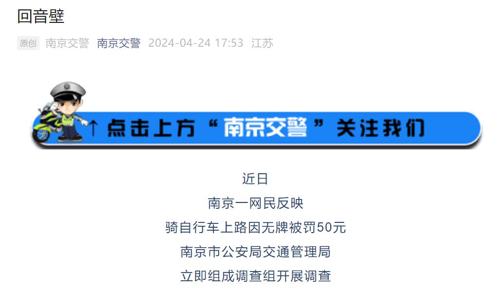 骑自行车上路因无牌被罚 50 元?南京交警:撤销处罚,对当事民警追究执法过错责任