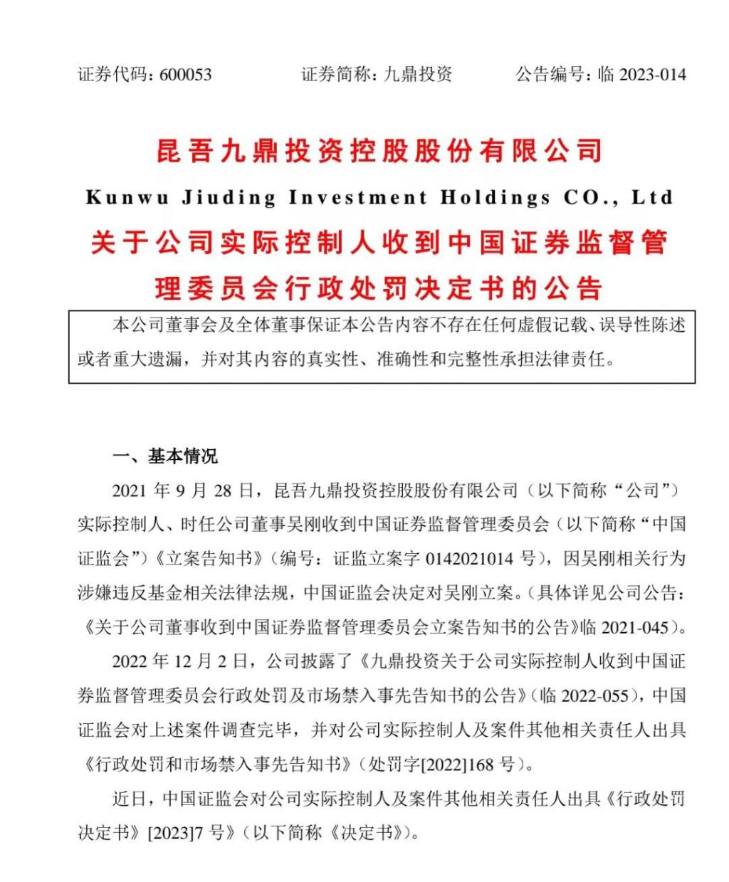另据报道,去年 2 月,因违反基金相关法律法规,九鼎投资实控人吴刚被证监会采取 5 年市场禁入措施,并处以 100 万元的罚款。