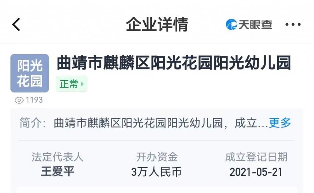 据报道,阳光花园幼儿园成立于 2021 年 5 月,位于云南省曲靖市麒麟区阳光花园南苑路 90 号,开办资金为 3 万元,法定代表人是王爱平。