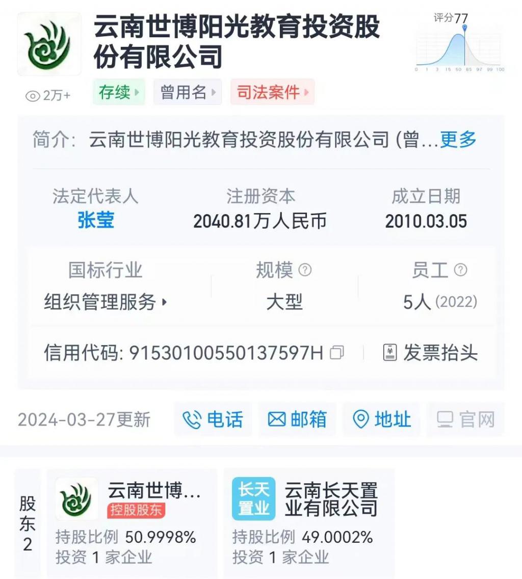 据报道,天眼查显示,云南世博教育成立于 2010 年 3 月,注册资本 2040.81 万元,法定代表人是张莹。该公司目前有两大股东,分别是云南世博九鼎旅游文化合伙企业(有限合伙)(简称 " 云南世博九鼎 ")和云南长天置业有限公司,持股比例为 50.9998% 和 49.0002%。其中,云南世博九鼎的 " 关联产品 / 机构 " 显示为九鼎投资。