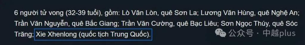 据越南快讯网透露,6 名死者中,有一名中国籍人员,名叫 Xie Xhenlong。从汉语拼音规则来看,越媒写错了,音译应该为谢 X 龙。
