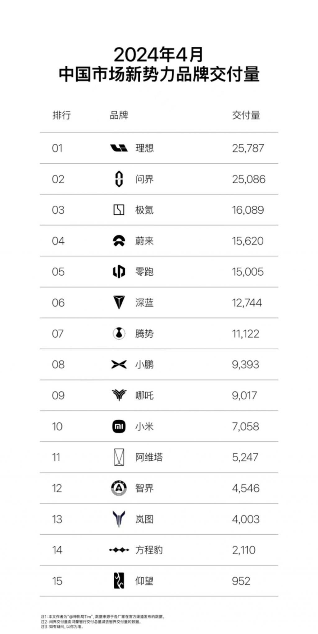 " 华为系 " 和小米汽车显然不是搅局者的角色,他们的身份,是冲着车市大魔王而来。鸿蒙智行 4 月交付近 3 万辆,问界 M9 交付 13391 辆,问界新 M7 交付 10896 辆,智界 S7 交付 4546 辆,鸿蒙智行全系 4 月蝉联新势力销量冠军。与此同时, 赛力斯第一季度开始盈利。