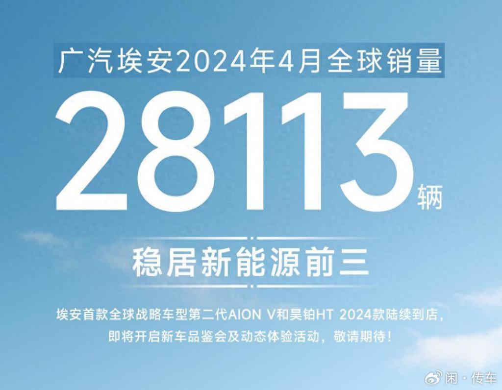 广汽埃安公布 4 月份全球销量 28113 辆 ,同环比双降。