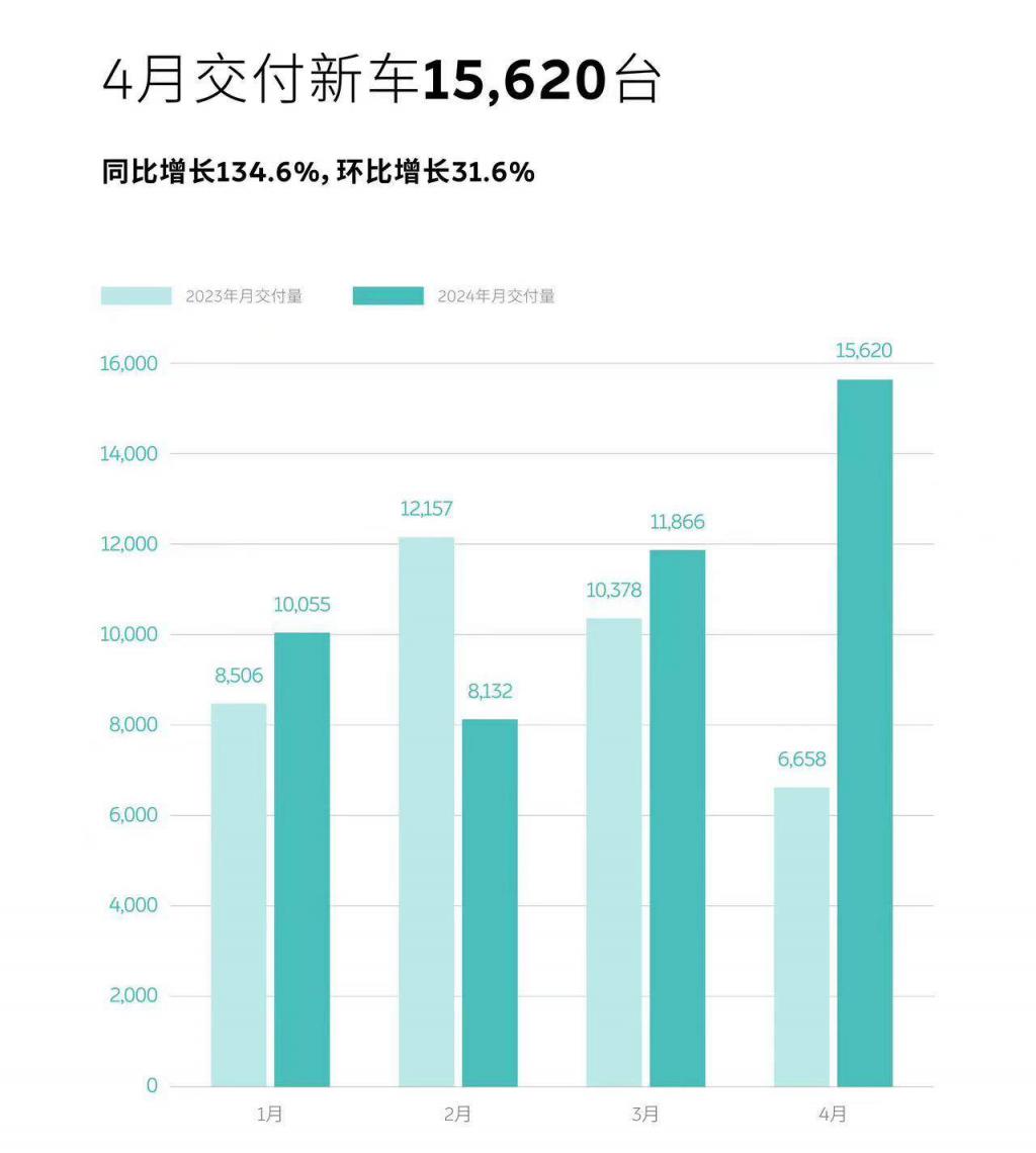 2023 年,蔚来汽车销量为 160038 辆,同比增长 30.7%。今年 1-4 月,累计交付 45673 辆汽车,同比增长 21.2%。虽然实现上涨,但从月均交付量来看,蔚来未能完全踏过月销两万辆的门槛。
