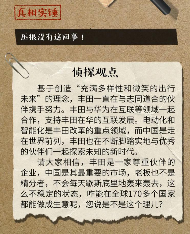 丰田中国表示,其为一家尊重伙伴的企业,中国是其最重要的市场,老板也不是 " 精分者 ",不会每天歇斯底里地 " 轰来轰去 ",否则便无法在全球 170 多个国家 " 都能做成生意 "。