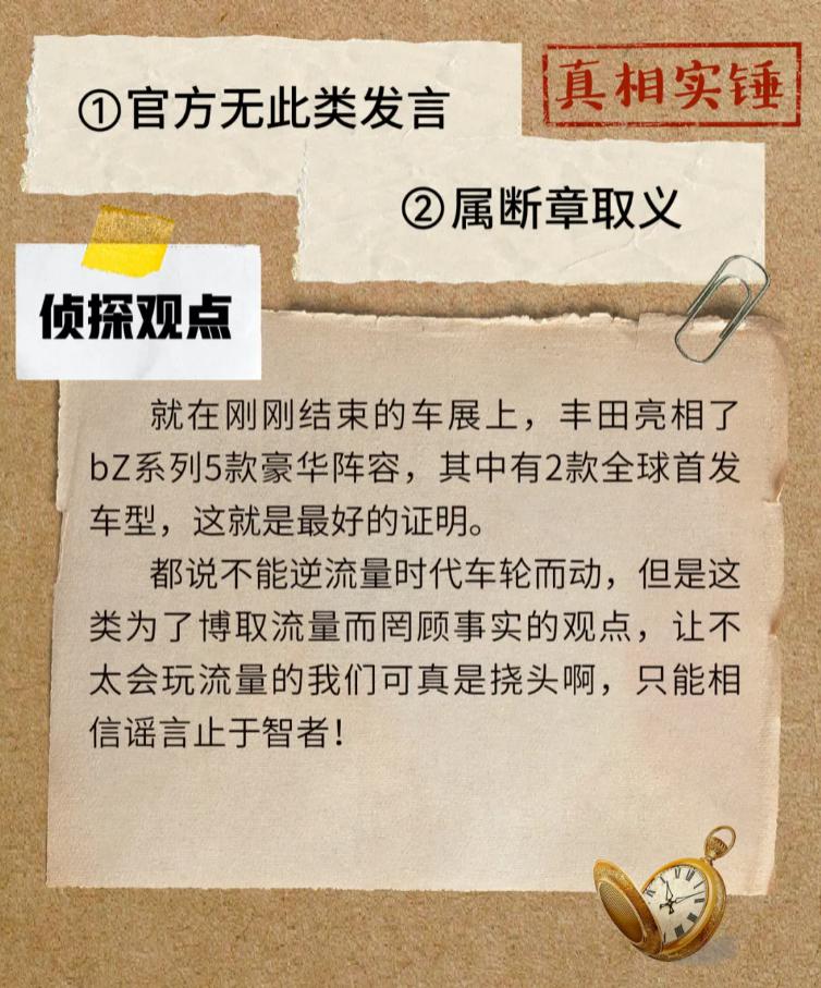 就 " 丰田章男抨击新能源市场乱象 " 这一传言,丰田中国称官方无此类发言、属 " 断章取义 ",公司在北京车展期间展出了 bZ 系列的 5 款 " 豪华阵容 ",含 2 款全球首发车型,就是 " 最好的证明 "。