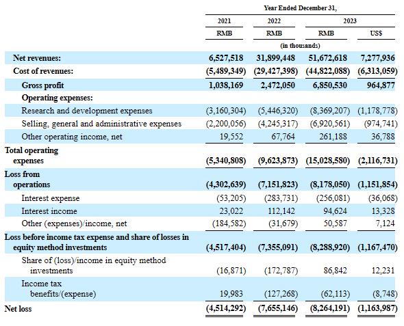 2021 年、2022 年及 2023 年,极氪的总收入分别为人民币 65.275 亿元、人民币 318.994 亿元及人民币 516.726 亿元,毛利率分别为 15.9%、7.7% 及 13.3%。2021 年、2022 年及 2023 年,极氪录得净亏损人民币 45.143 亿元、人民币 76.551 亿元及人民币 82.642 亿元。