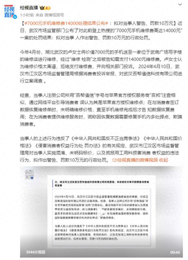 7000元手机维修费14000处理结果公布 :拟对当事人警告、罚款10万元