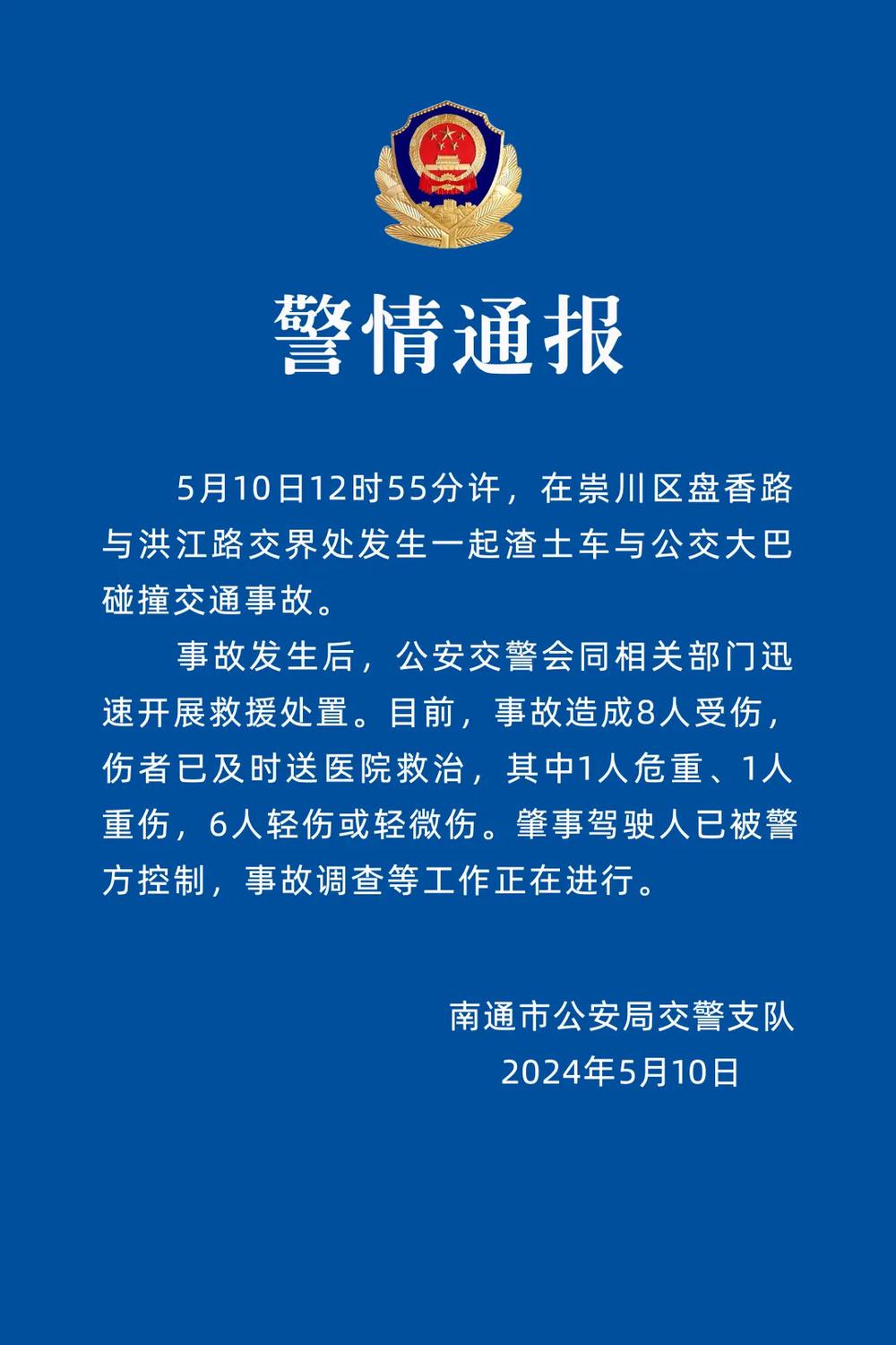 10 日下午 3 点多," 南通交警 " 微信公众号通报,事故造成 8 人受伤,肇事驾驶人已被警方控制。以下为通报全文: