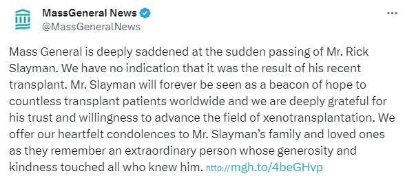 马萨诸塞州总医院的移植团队在一份声明中表示,他们对 Slayman 的去世深感悲痛,并向他的家人表示哀悼。不过,没有任何迹象表明他死于移植手术,Slayman 的具体死因也尚未公布。