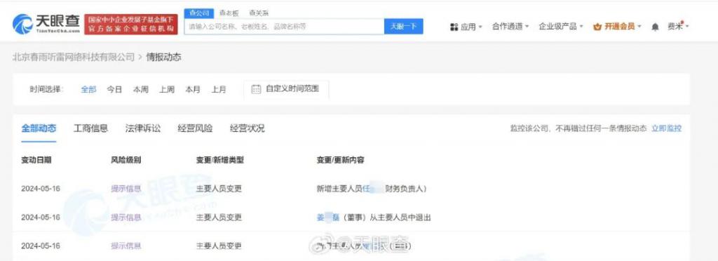 天眼查 App 显示,近日,「北京春雨听雷网络科技有限公司」发生工商变更,姜某磊(papi 酱)卸任该公司董事,由霍某芳接任。
