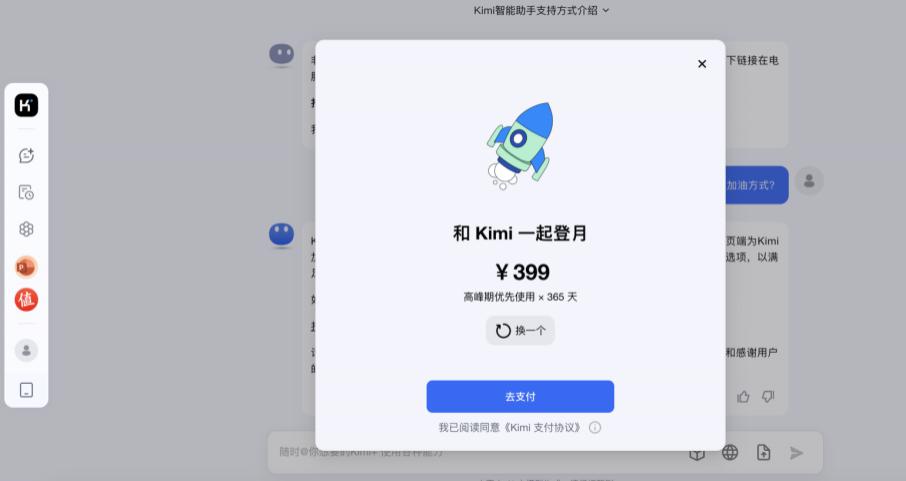 最高档 399 元,和 Kimi 一起登月,优先使用 365 天,相当于包年会员。