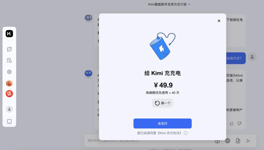 49.9 元给 Kimi 充电,优先使用 40 天。