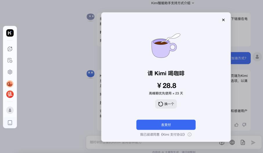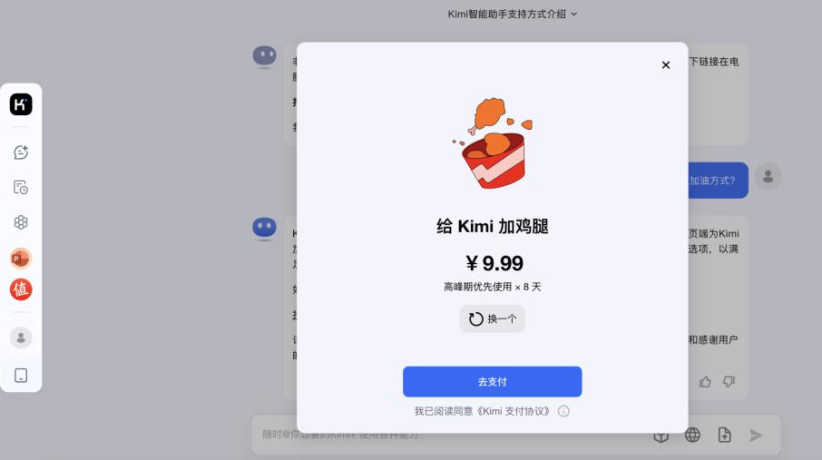近日,Kimi 推出了 " 打赏 " 功能,用户可通过支付对 Kimi 进行 " 打赏 ",金额从 5.20 元到 399 元不等,每一档,对应着不同的高峰期优先使用时长。