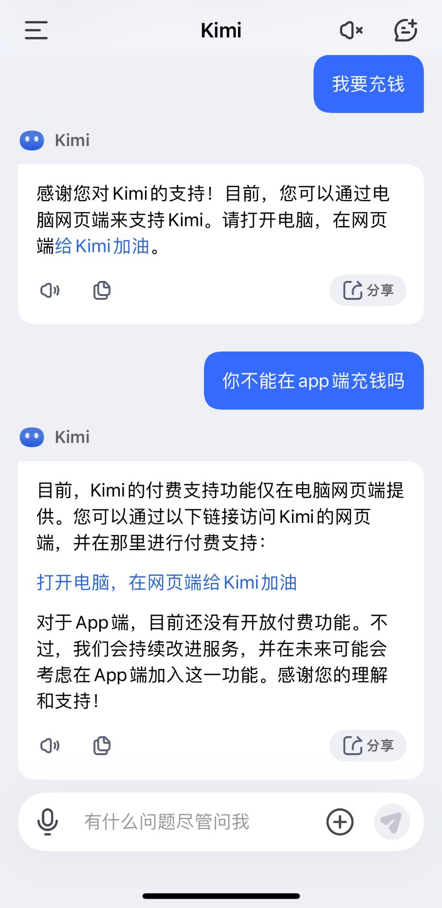 需要指出的是,目前 Kimi 仅支持通过网页端接受用户的打赏,App 端还没开通付费功能。