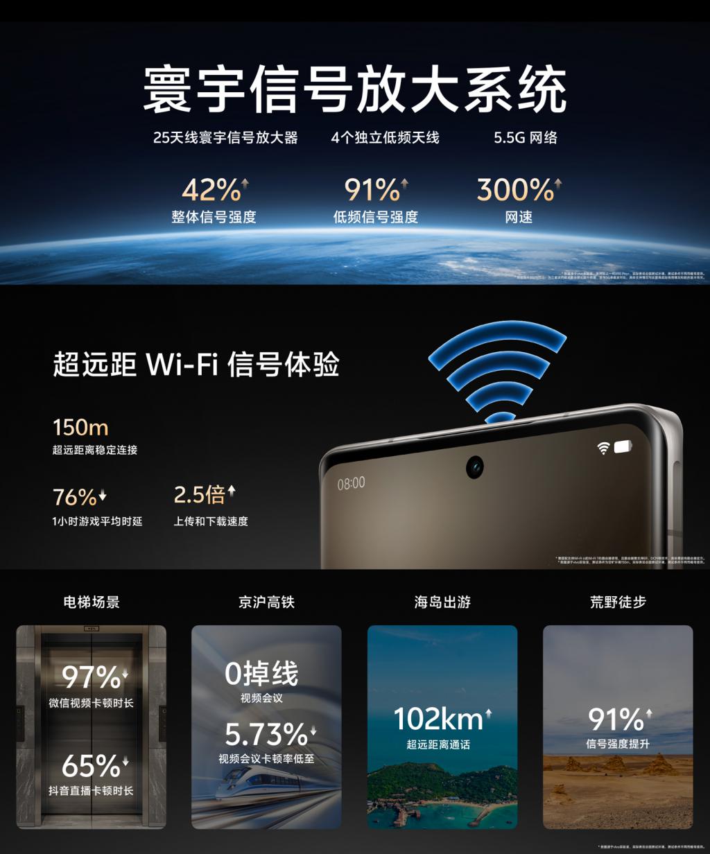 vivo X100 Ultra 采用寰宇信号放大系统,整体信号强度提升 42%。低频信号强度提升 91%,同时支持网速 3 倍提升的 5.5G 网络,150m 超远 Wi-Fi 稳定连接。