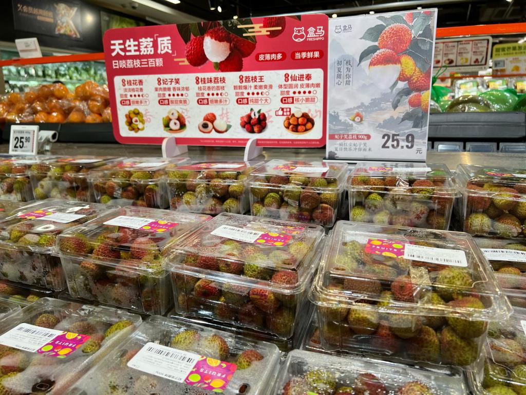 " 一个月前我们上的是海南产的早熟品种桂花香。妃子笑虽然今年上市晚,但价格降幅较大。刚上市时价格大概是 39.9 元 450 克,现在已经降了一半还不止。目前正是妃子笑大量上市的时候,价格和味道都很好,很受顾客欢迎。25.9 元 /900 克的价格是我们昨天才开始推出的。" 盒马喜盈门店店长刘喜雯告诉记者。