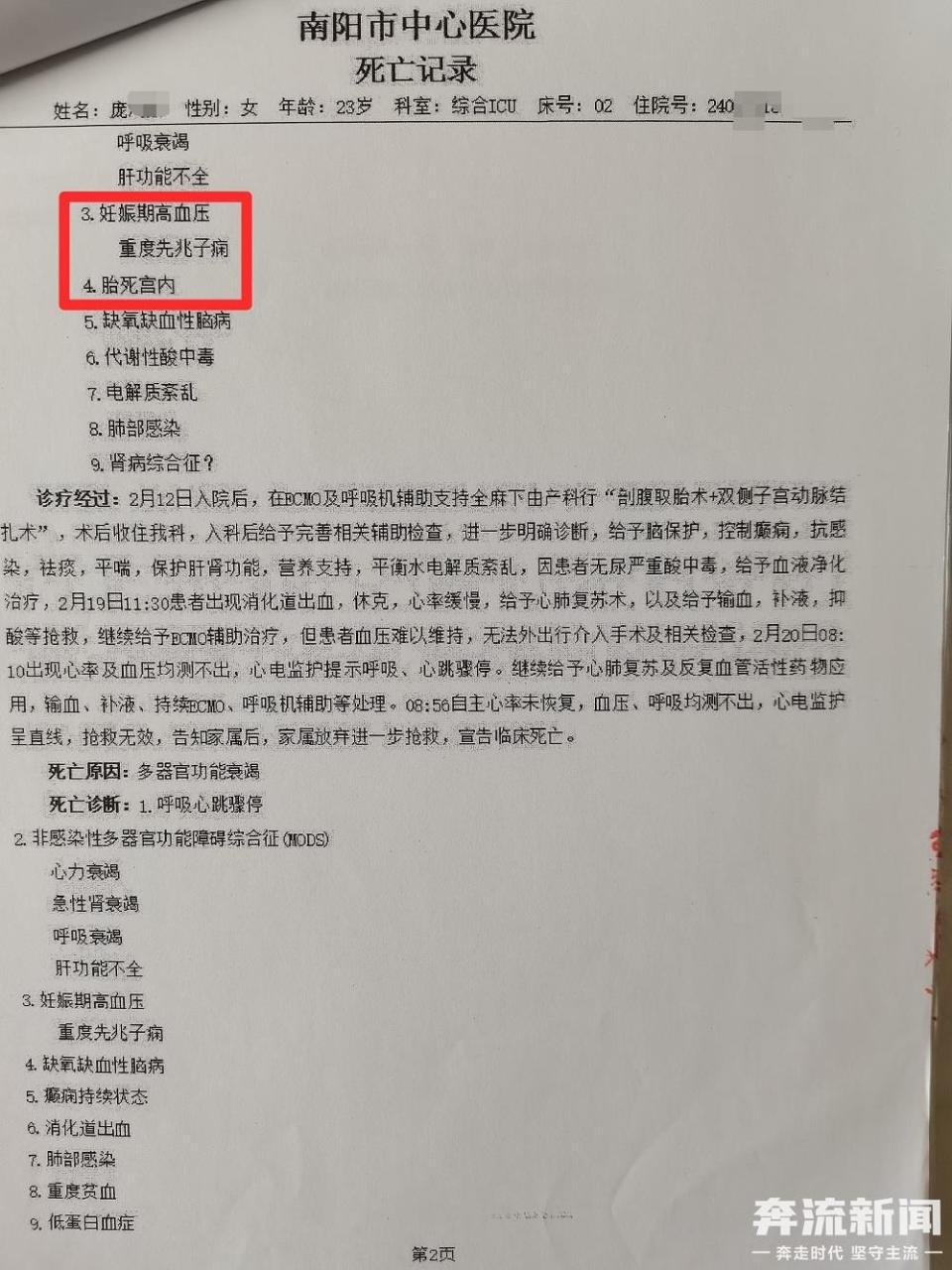 2 月 12 日上午,丽丽被转运到南阳市中心医院急危重症孕产妇救治中心,诊断结果和南阳市第一人民医院一致,立即安排进行剖宫取胎手术。手术后,丽丽一直在昏迷状态,持续到 2 月 20 日死亡。