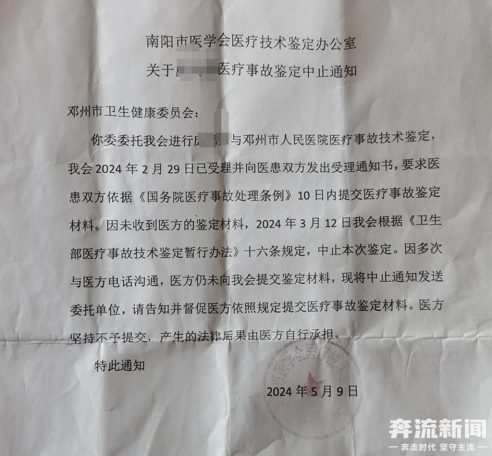 为了查明女儿的死因,在庞先生的申请下,邓州市卫健委委托南阳市医学会进行医疗事故鉴定,但在近日收到了一份医疗事故鉴定中止通知。