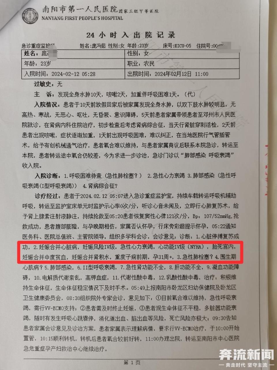令庞先生意外的是,在南阳市第一人民医院抢救的过程中,医生发现丽丽怀孕并胎死腹中。抢救记录显示," 患者腹部膨隆,与孕晚期相仿,彩超提示怀孕 "。会诊后认为是妊娠合并心脏病,胎死宫内,孕 31 周 +。