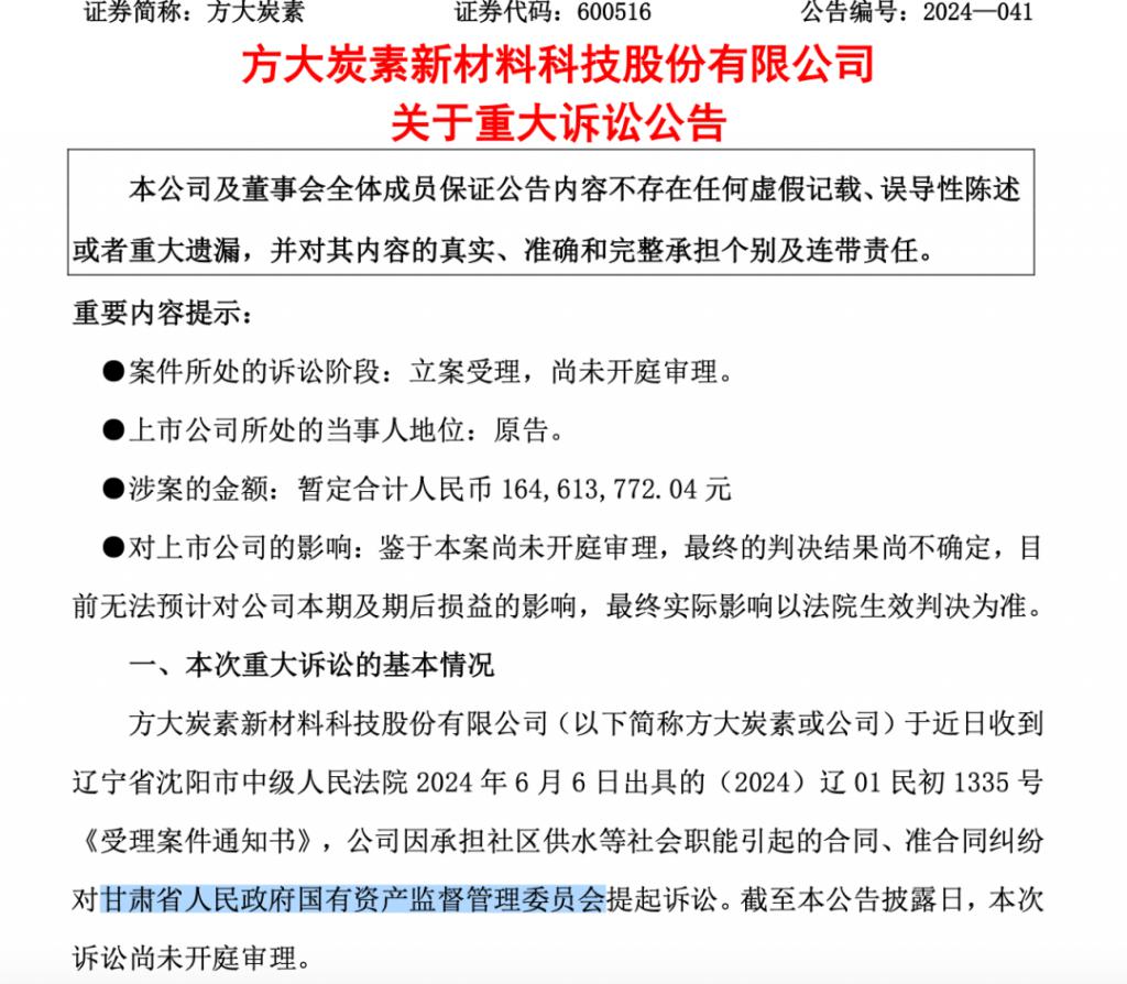 6 月 11 日晚间,方大炭素公告,公司于近日收到辽宁省沈阳市中级人民法院 2024 年 6 月 6 日出具的(2024)辽 01 民初 1335 号《受理案件通知书》,公司因承担社区供水等社会职能引起的合同、准合同纠纷对甘肃省人民政府国有资产监督管理委员会提起诉讼。截至本公告披露日,本次诉讼尚未开庭审理。