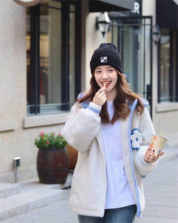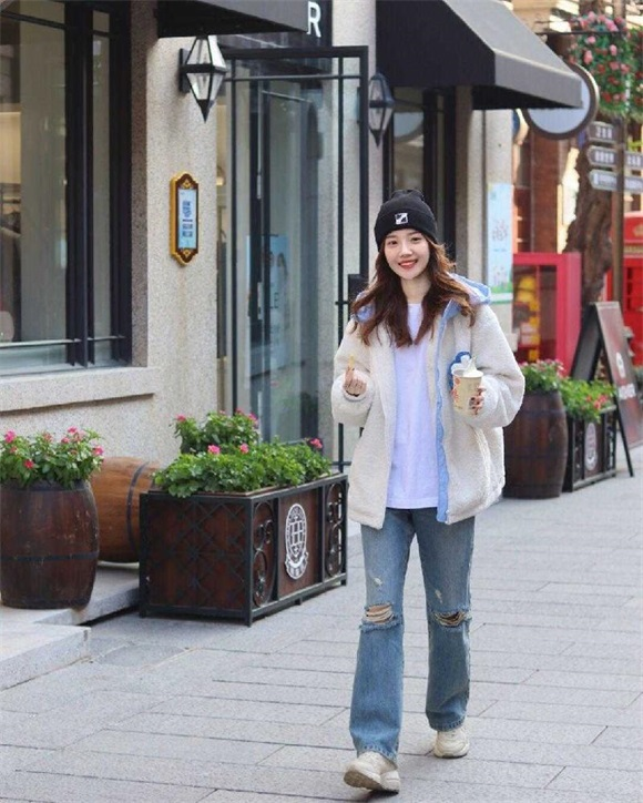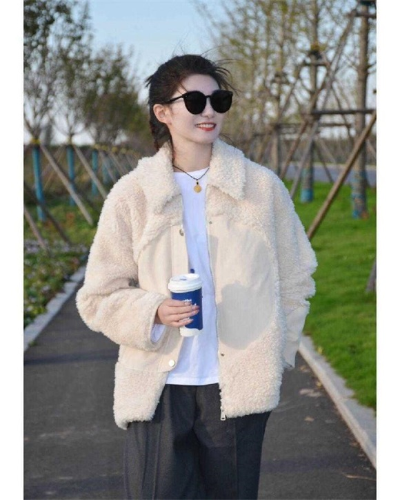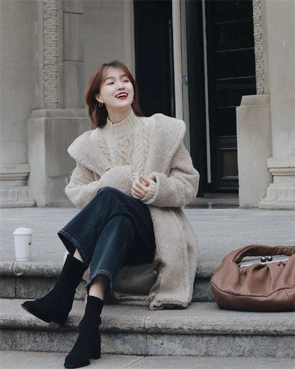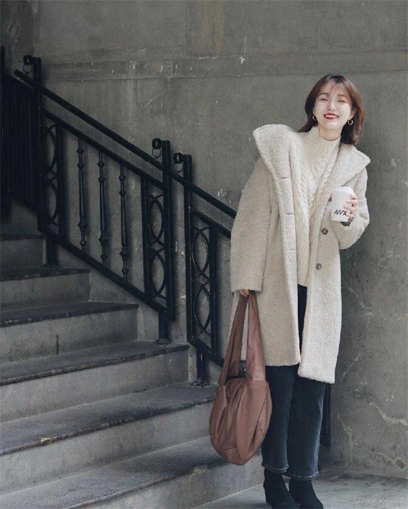 米白色羊毛羔外套,既能满足保暖的需求,又能利用软糯糯的衣身,给人留下一种减龄又奶fufu的既视感,特别适合在校女大学生选择。