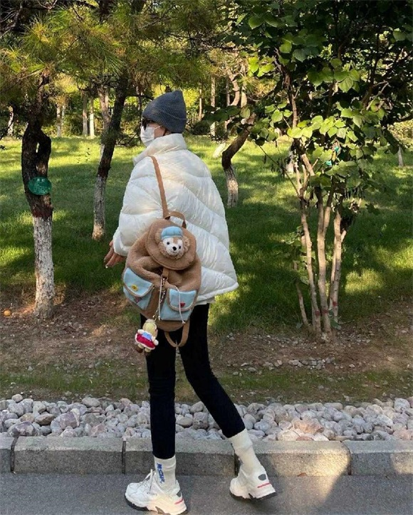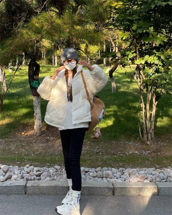 但如果大家选择连帽款的白色羽绒服,扎个高高的马尾辫是最显精神,最干练的造型!