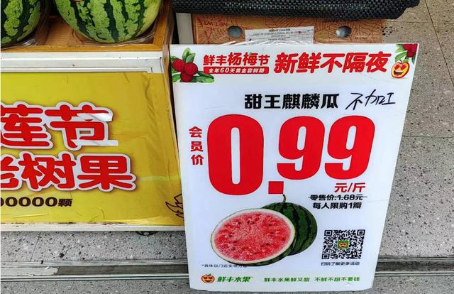 此外,在附近的鲜丰水果店,记者看到,以物美价廉著称的甜王西瓜,价格也低至 0.99/ 斤。