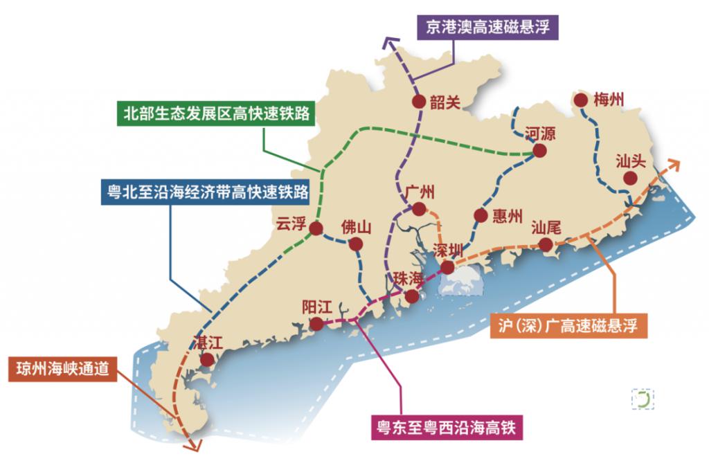 《广东省国土空间规划(2020-2035 年)》提出,围绕构建 " 一核一带一区 " 区域发展格局,建设上海-汕头 - 汕尾 - 深圳 - 广州(沪深广高速磁悬浮)、北京 - 韶关 - 广州 - 佛山 - 珠海 - 澳门(京港澳高速磁悬浮)的磁悬浮线路,还有阳江 - 珠海 - 深圳高铁(赣深客专西延线)、琼州海峡通道。